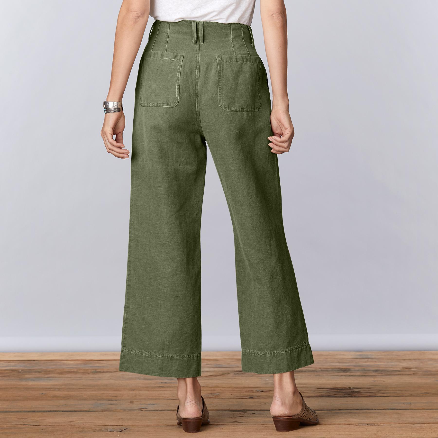 Stylish and relaxed. our cropped wide leg pants are a must with decorative front and back darts. topstitching detail. back patch pockets and front slash pockets. Cotton/linen. Machine wash. Imported. Exclusive. Sizes 2-16. 26 inseam.