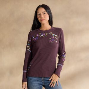 A Sundance classic body in new floral embroidery. our comfortable crewneck thermal boasts wide cuffs accented with velvet trim detail and metal buttons. Cotton/spandex. Machine wash. Imported. Exclusive. Sizes XXS (00). XS (0?C2). S (4?C6). M (8?C10). L (12?C14). XL (16?C18). Approx. 23.5l.