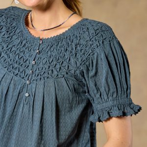 Feminine and textured. our Lodi Top is designed in bold colors with intricate details of lace and pineapple smocking. Button placket with loop closure. Elastic cuffs. Cotton. Machine wash. Imported. Exclusive. Sizes XS (0–2). S (4–6). M (8–10). L (12–14). XL (16–18). XXL (20–22). Approx. 24.5l.