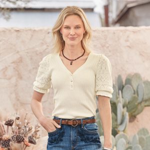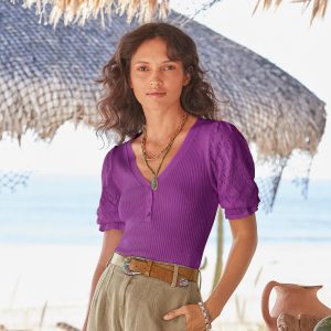 Experience the essence of luxury in our feminine and fitted V-neck henley. so soft in our Legends Lightweight Yarn. Beautiful pointelle at the bold puff sleeves and special scalloped trim details add an extra touch of grace. Organic cotton/nylon/spandex. Machine wash. Imported. Exclusive. Sizes XS (0–2). S (4–6). M (8–10). L (12–14). XL (16–18). XXL (20–22) Approx. 22.5l.