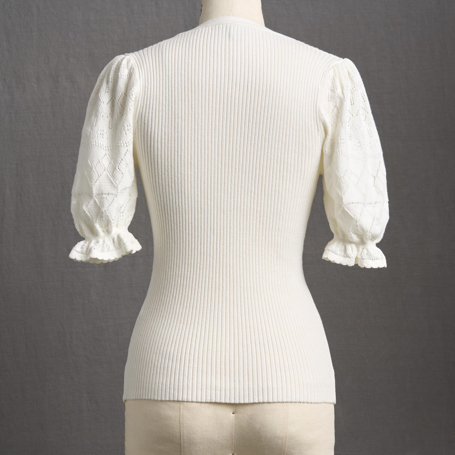 Experience the essence of luxury in our feminine and fitted V-neck henley. so soft in our Legends Lightweight Yarn. Beautiful pointelle at the bold puff sleeves and special scalloped trim details add an extra touch of grace. Organic cotton/nylon/spandex. Machine wash. Imported. Exclusive. Sizes XXS (00). XS (0–2). S (4–6). M (8–10). L (12–14). XL (16–18). Approx. 20.5l.